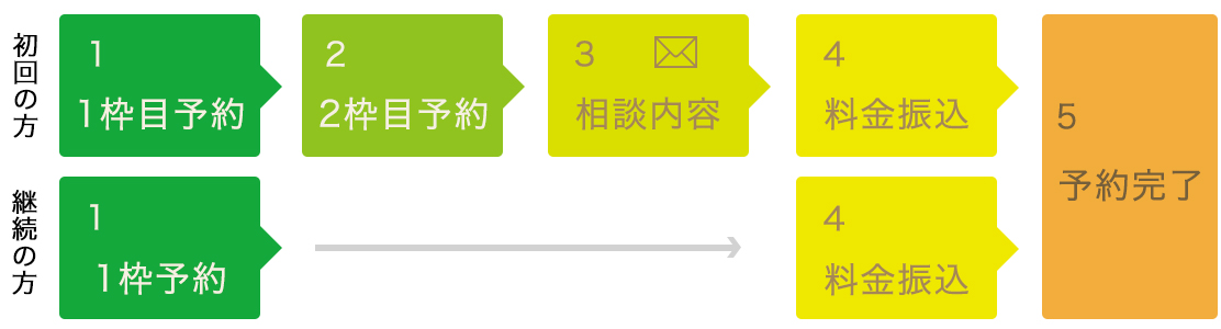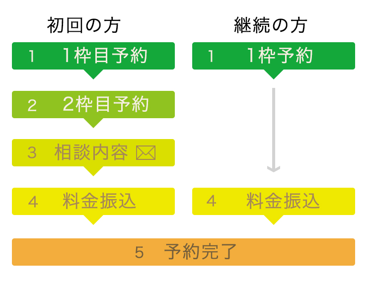 1日の時間枠は4枠ですが、1枠が継続の60分設定な為、同日で連続する2枠をご予約下さい。